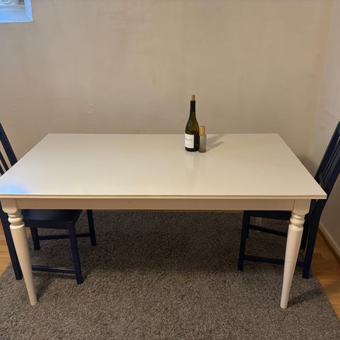 Selger et pent brukt spisebord. Bordet har en mørk brun bordplate og hvite, skråstilte ben som gir et moderne uttrykk.