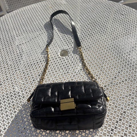 Sort . Fine detaljer . Ett stort rom og ett lite , begge med glidelås . Ett rom uten lås i front . Mål : Ca. 25 cm. Høyde . Bredde ca. 23 cm. Spennen holder vesken på plass. Noe tyngde , for det . Kan sendes . Kjøper står for frakt . Hentes e. avtale i Oslo . Bruker ikke fiks ferdig . Vips . Sender med Posten .