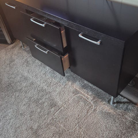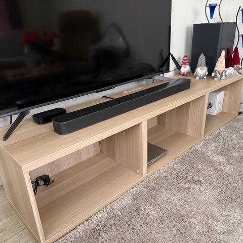 Godt brukt hylle, brukt som TV-benk. Se bilder for bruksslitasje. Ellers i god stand, stabil og solid.