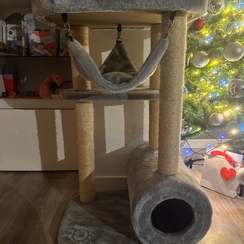 klatrestativ med flere plattformer, hule og klorestolper. Materialer inkluderer tre, tau og stoff i grå og naturfarger. Designet for katter å klatre, hvile og leke.