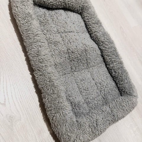 Ubrukt seng til katt eller liten hund. Sengen har myk og plysj tekstur med en polstret pute. Baksiden har antiskli-materiale for stabilitet. Kjøpt på Musti. 60x50 cm