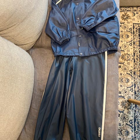Regntøy fra Reima, noe slitasje på knærne på buksa, ellers i god stand.