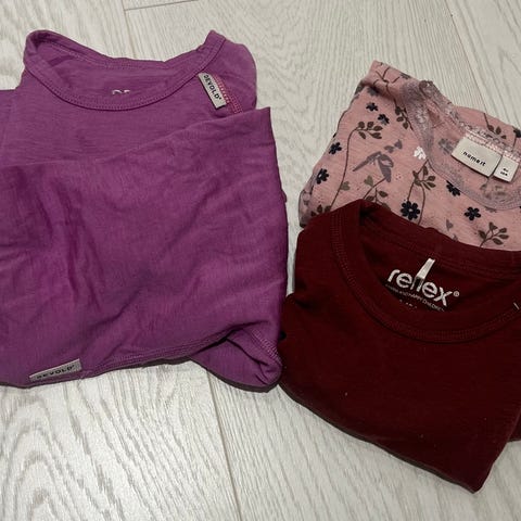 Klespakke med fem ulltrøyer, to ullstilongser, et par strømpebukser og et fleecesett. Alt passer fint sammen. Det er litt varierende kvalitet, men mye av det er pent brukt.