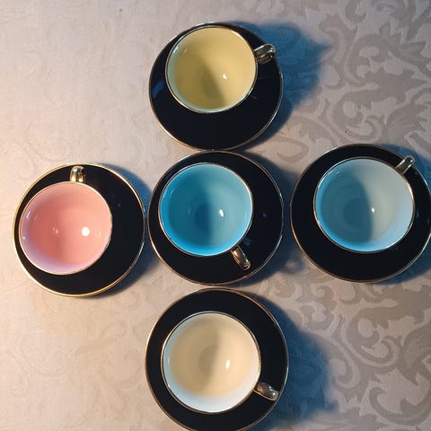 6 kaffekopper m/underskål og asjett i 3 forskjellige pasteller med gullkant. (2 Rosa, 2 lyseblå og 2 gule)