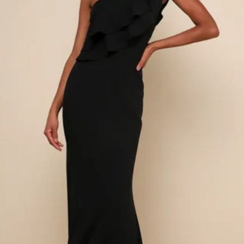 Nydelig, lang kjole i shiny materiale. Mørk brun i fargen. Diamantaktige detaljer på venstre stropp - mangler en stein, og kan også sikkert fjernes (er sydd på). Ikke merket med størrelse, anslår large. Merket Lulu H, Paris.