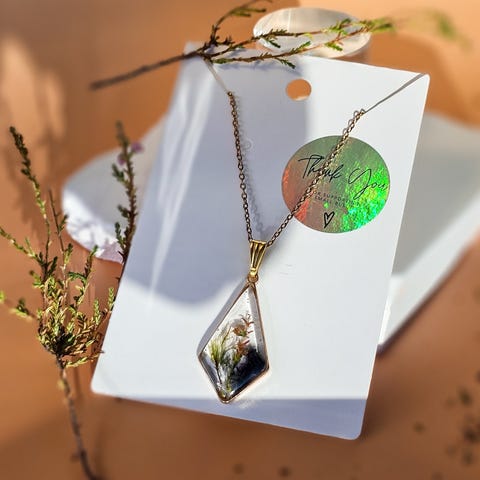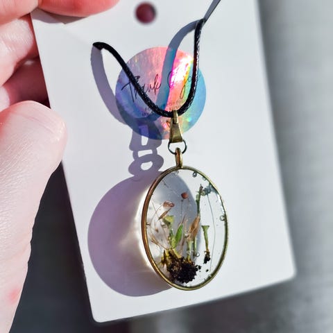 Halskjede med lenke i gullfarget, rustfritt stål med håndlaget, anheng i resin. Anhenget er håndlaget og inneholder tørkede elementer fra naturen og fargepigmenter.