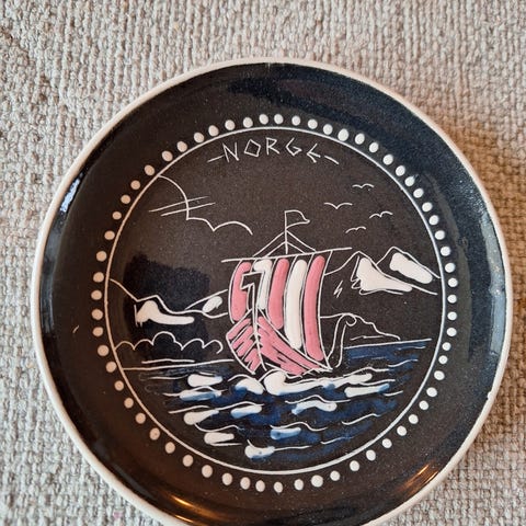 Selger keramikkfat med vikingskipmotiv, produsert av norske Arol Keramikk. Veggdekoren er laget av keramikk med en karakteristisk glasur. Motivene i relieff viser stiliserte vikingskip. Liknende gjenstander er identifisert som norsk retrodesign fra Arol. De to øverste er runde fat (antakeligvis brukt når de røkte eller for røkelse før i tiden), mens den nederste er dråpeformet et hull for oppheng.