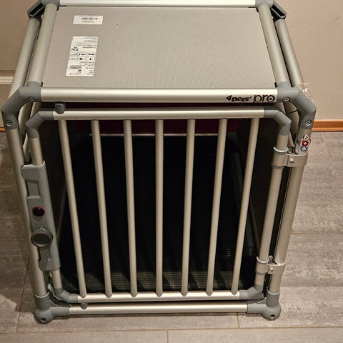 Transportbur for middels stor hund, laget av aluminium. Buret har en solid konstruksjon med metallgitter, myk gummimatte på gulvet og en lukket bakvegg, som gir økt sikkerhet for hunden ved kollisjon. Egnet for transport av hunder fra 30 kg og opp til 40kg. Jeg har brukt buret til en Bernersennen på 40kg. Buret har skråvegger både foran og bak og legger seg derfor fint inntil seteryggen på baksetet, samtidig som det gir god plass til bakluken. Buret har noen synlige bruksmerker men er helt og fint. Finner desverre ikke nøkkelen til låsen.