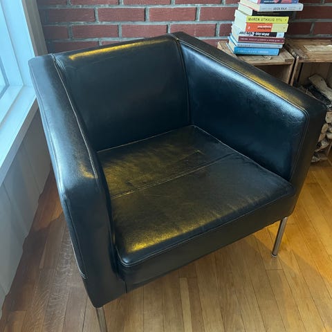 Stolen har en større sprekk i siden. Dette kan fikses med trelim eller lignende. Den er fortsatt solid og ellers i fin stand.