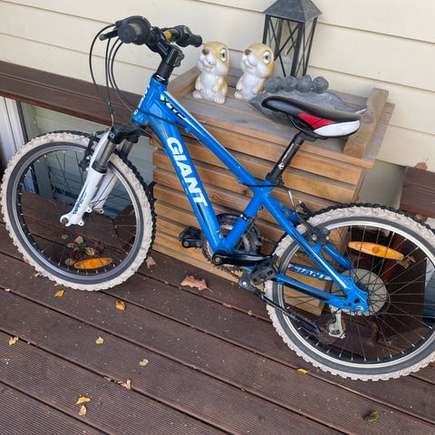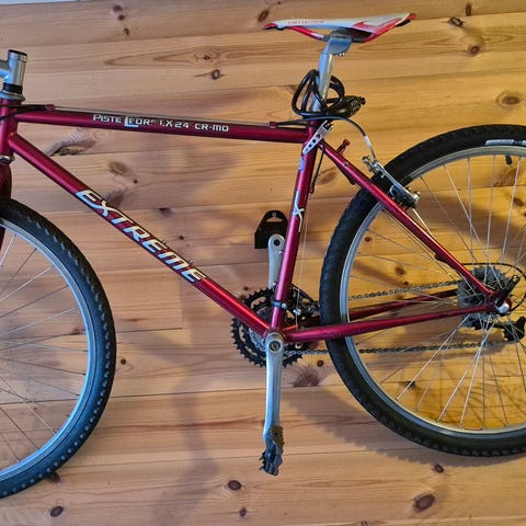 Er montert på håndbrems, lang setepinne følger med. Kjøpt ny av oss, brukt av to barn. Er bruksmerker og riper på sykkelen. Tatt god vare på og oppbevart inne eller i garasje.