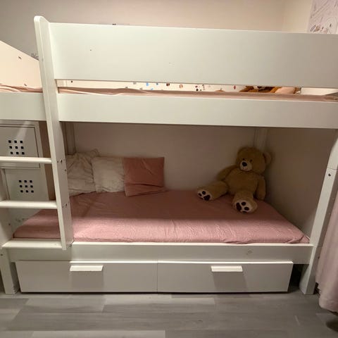 Køyeseng i massiv furu. Sengen er malt med to strøk (beige), og trenger kun ett strøk i ønsket farge for å se helt ny ut.