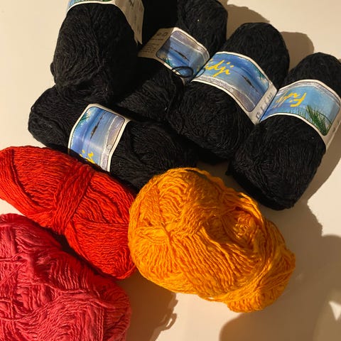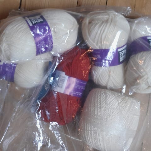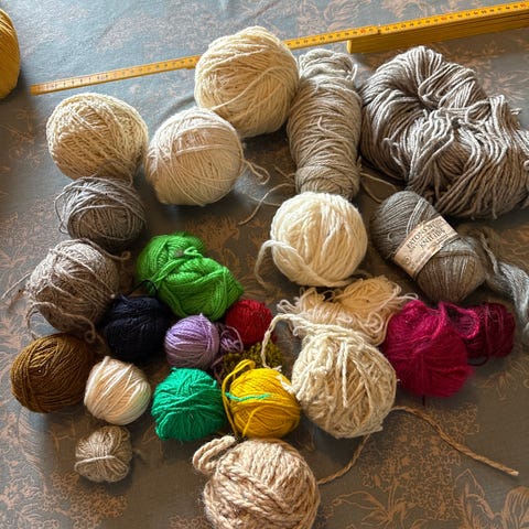 Restegarn + en del nøster som ikke er åpnet. Mest ull, men også noe bomull og litt akryl. Følger med et prosjekt jeg har gitt opp, bestående av bestemorruter. Sydd sammen til en jakke men passformen er helt feil så denne må tas opp og sys på en annen måte eller man kan bruke den til noe annet.