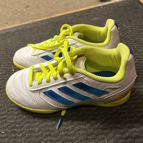 Adidas Sala innendørsfotballsko i størrelse 33. Skoene har hvit farge med gullfargede detaljer og svarte lisser. Egnet for innendørs bruk.