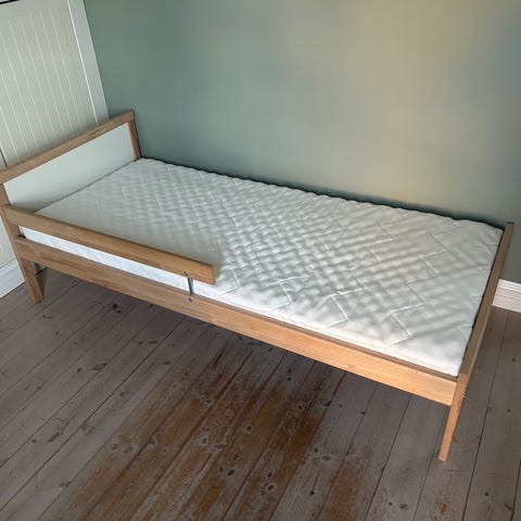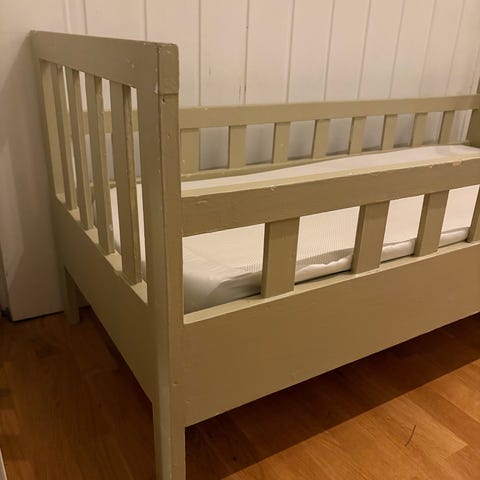 Furu seng 80 x 200 cm. Passende madrass kan medfølge ved ønske. Alt i god stand med alle skruer som hører til.