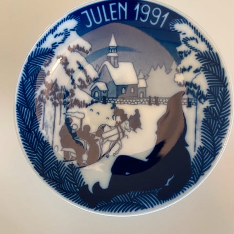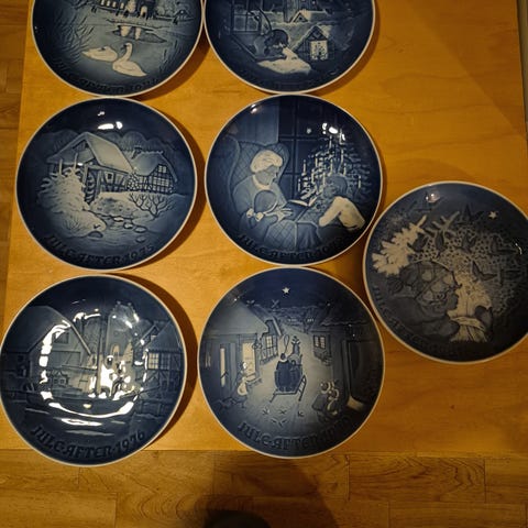 Julen dekorasjonstallerkener fra årene 1970 til 1977. Hver tallerken har blå og hvit farge med julemotiv og årstall trykt på kanten. Tallerkenene er laget i porselen og egnet for samling eller dekorasjon. Selges samlet for 300.