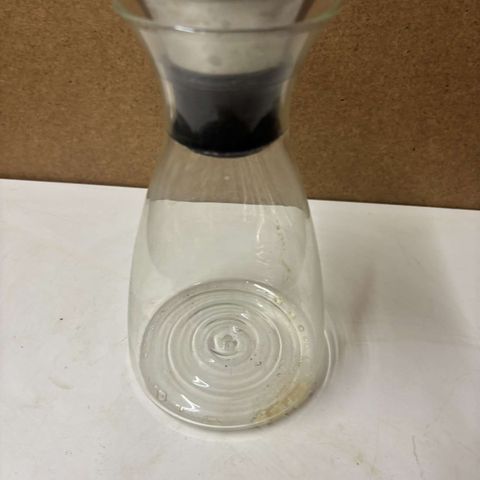 Eva Solo vannkaraffel fra Kitchn, laget av klart glass med svart lokk. Karaflen har et moderne design og er egnet for servering av vann eller andre kalde drikker.