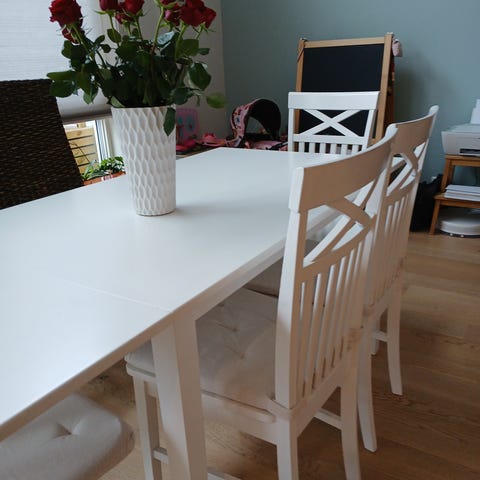 Noen år gammelt bord og fire stoler som ble kjøpt sammen fra Trademax. Man kan se noe bruksmerker på bordplaten, men ellers ok.