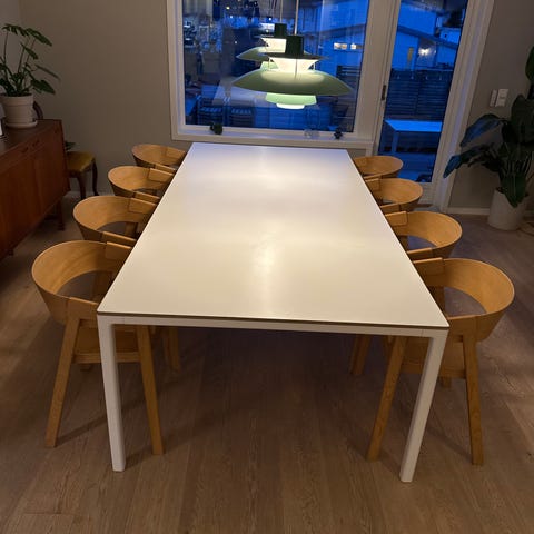 Spisebord med ileggsplate selges. Bordet blir med ekstra del 215 cm. Selges til 1500. Nypris 4500,-