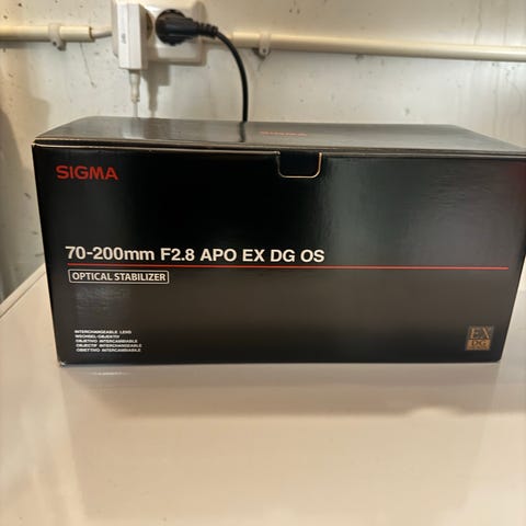 Sigma 70-200mm F2.8 DG DN OS S teleobjektiv. Objektivet har en brennvidde på 70-200 mm, blenderåpning på F2.8 og optisk bildestabilisering (OS). Leveres med original emballasje og tilbehør som objektivhette og bæreveske.