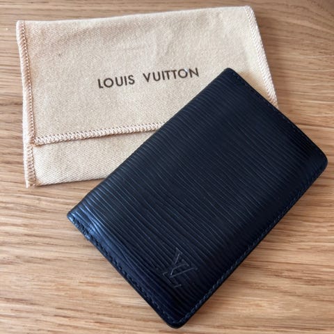 Christian Dior kortlommebok laget i lær, designet for dame eller unisex bruk. Lommeboken har flere kortlommer og et hovedrom for oppbevaring av kort og sedler. Materialet er lær med et mønster på utsiden og et metallisk logoemblem. Passer til daglig bruk for organisering av kort og kontanter.