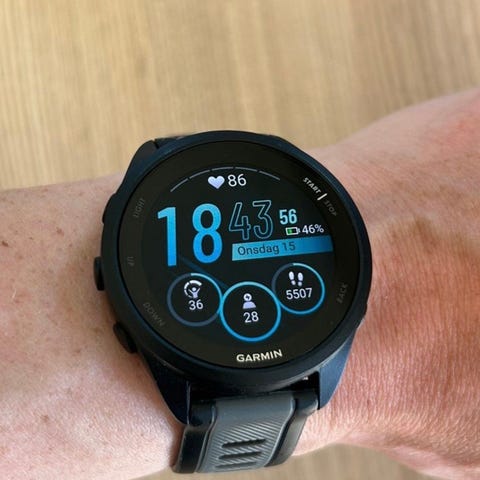 Garmin Forerunner 165 smartklokke i fargen tåkegrå/whitestone. Klokken har en rund skjerm og silikonrem med flere justeringsmuligheter. Leveres med ladekabel og original brukerveiledning. Egnet for trening og daglig bruk.