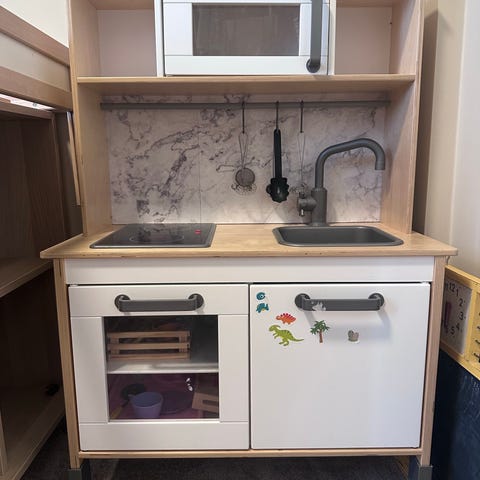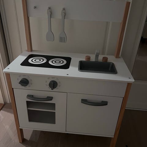IKEA lekekjøkken i tre med ovn, vask, kokeplate og flere tilbehør. Kjøkkenet er fint brukt, med noen merker etter klistremerker og tusjmerker. Kan vaskes/males.
