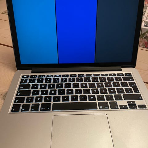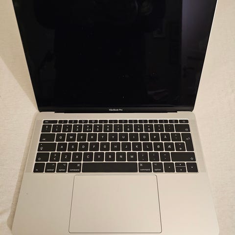Macen har 4 Thunderbolt/ USB-C-porter. Den nærmest skjerm på venstre side fungerer ikke lenger. Det er også noen småmerker langs kantene, se bilder.