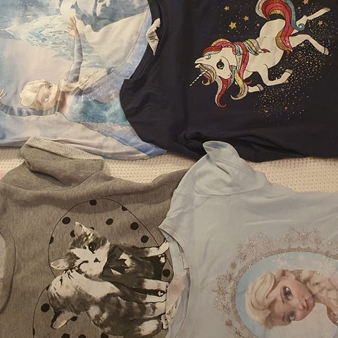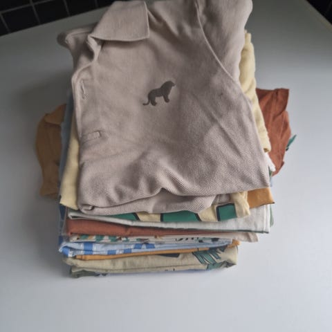 4 T-skjorter og en skjorte. Ingen hull eller slitasje, men alle er brukt en del. Liten flekk på skjorte, som vist på siste bilde. Selges samlet.