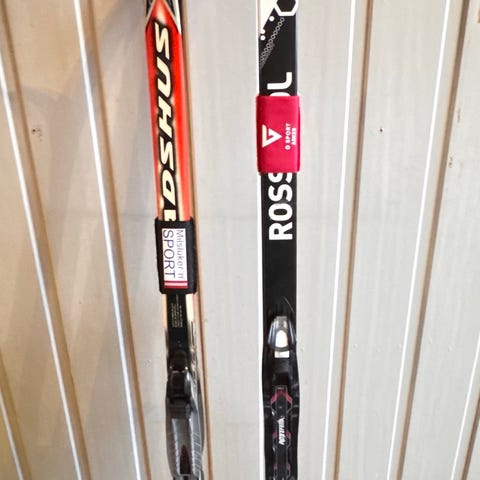 Selger tre par skistaver: Swix Star jr 115 cm kr 200, KVT Tornado 120 cm kr 500 og Swix Triac jr lengde 125 cm kr 400.