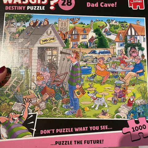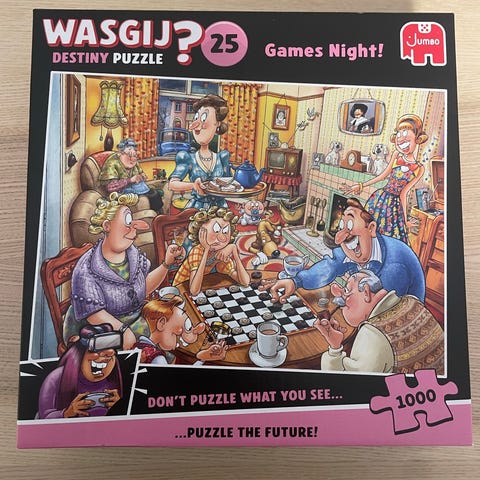 Jumbo Wasgij Destiny Puzzle med 1000 biter. Puslespillet har ulike motiver fra serien Destiny, inkludert High Season, The Toy Shop, og How Times Have Changed. Egnet for voksne og eldre barn som liker utfordrende puslespill med humoristiske og detaljerte illustrasjoner.