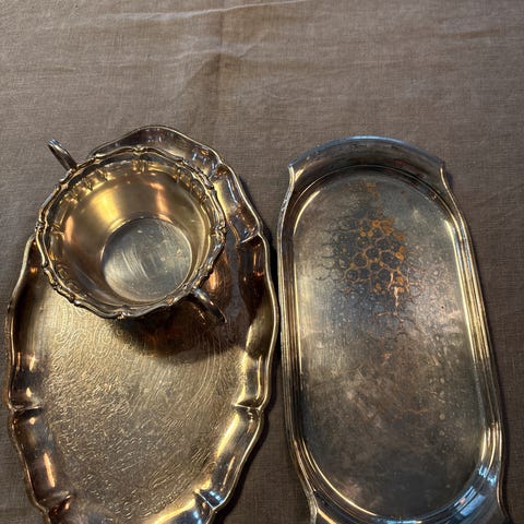 Settet er brukt og har fått en naturlig patina over tid, noe som gir det et vakkert antikkpreget uttrykk. Kan pusses om man ønsker en blankere overflate.