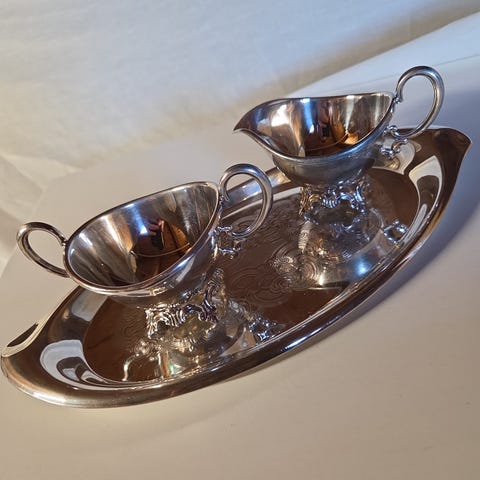 Selger et nydelig sett bestående av fløtemugge og sukkerskål på tilhørende brett. Settet har et svært elegant og klassisk design med sirlige mønsterdetaljer og dekorerte håndtak.