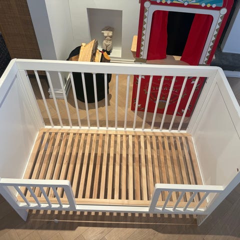 Hvit Sprinkelseng fra barnas hus kjøpt i 2021. Brukt av to barn. Justerbar bunn.