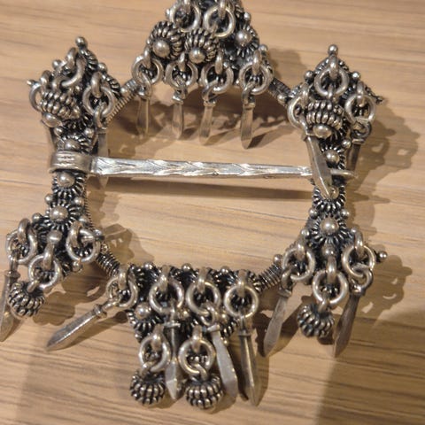 Byggkornring til Telemarksbunad i 830 antikkforgylt sølv. Denne brukes som halssølje eller som den midterste søljen på brystet. Nypris ca. 4400,-