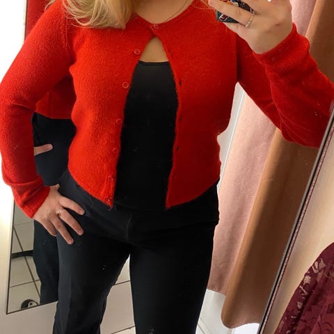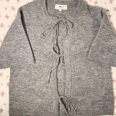 Pen lysegrå cardigan med snøring i livet fra Gina Tricot. Str M. Den har trompetermer og sitter veldig pent på. Den er bare brukt 1 gang.