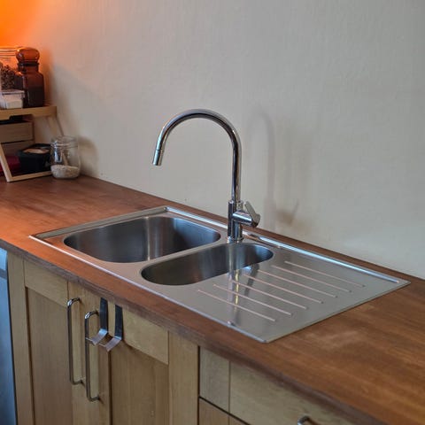 Kjøkkenvask i rustfritt stål med to kummer, hvorav en mindre til tilbehør eller vask, samt et avrenningsfelt. Vasken har ett hull for armaturmontering. Designet for praktisk bruk på kjøkken.