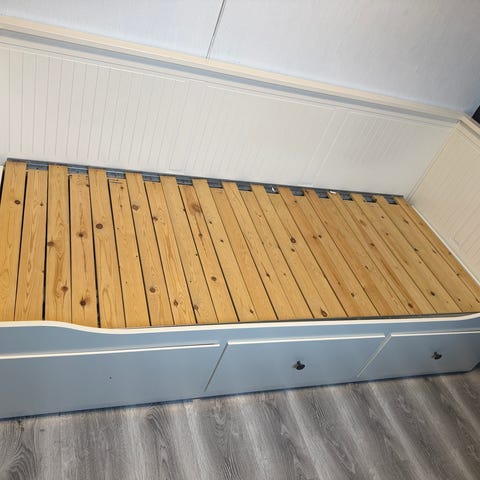 Hemnes dagseng med tre skuffer til oppbevaring. To madrasser følger med. Ingen merker, meget pent brukt.
