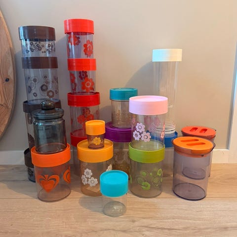 Rødt spisesett til sushi, bare hatt som utstilling.