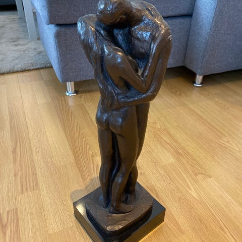 Bronse skulptur som forestiller abstrakte figurer. Skulpturen har en høyde på cirka 30 cm. Materialet er bronse, og den har en grønn patina. Skulpturen kan brukes som dekorasjon i hjem eller kontor.