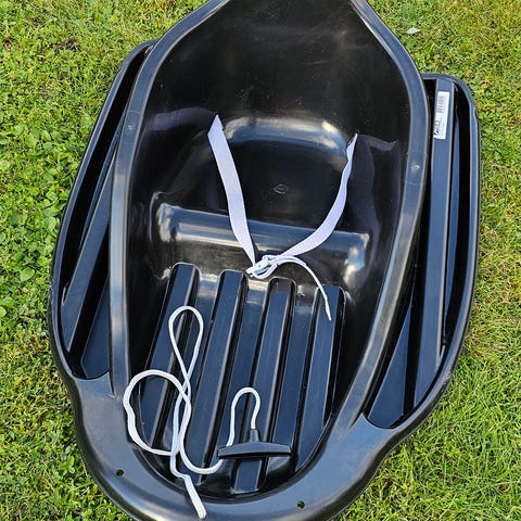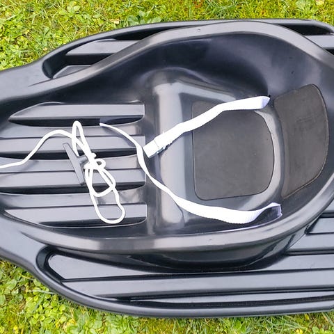 Akebrettet har høy rygg og sikkerhetsbelte, så barnet sitter trygt og godt under lek.