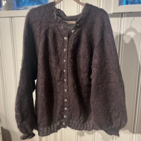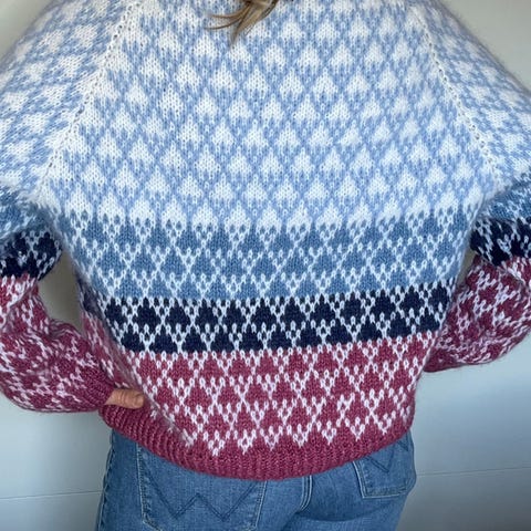 Hjemmestrikket god og varm «Tonegenser» i lys rosa «Påfuglgarn» fra Line Langmo/ Dale Garn. Garnet består av 73% mohair, 22% ull og 5% polyamid. Romslig i størrelsen.