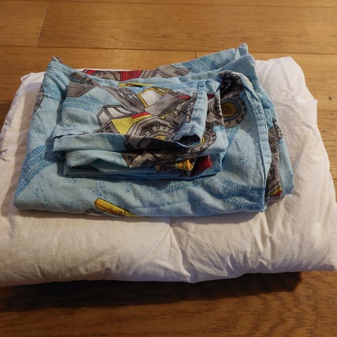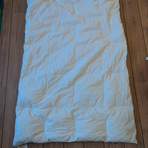 Lite brukt da frøkna ikke var noe glad i å ha dyne på seg. Ingen flekker og er nyvasket. Følger med et sett pute/dynetrekk som passer til dynen.