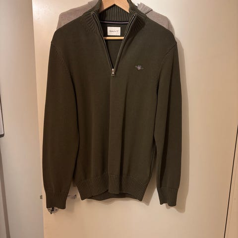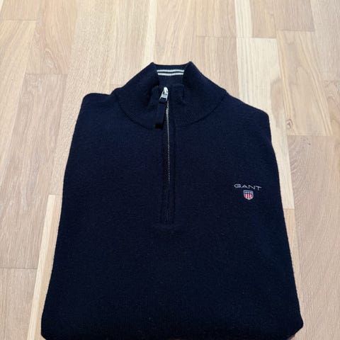 Selger en helt ny, aldri brukt GANT half-zip genser i 100 % lammeull. Farge: dyp marineblå – tidløs og elegant. Str. M passer perfekt til deg som vil ha en klassisk passform med luksuriøs komfort.