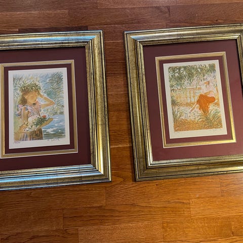 Rammet inn i gullramme, noen bruksmerker på rammen.