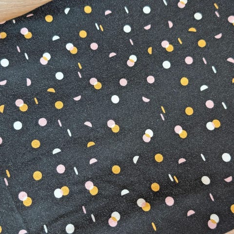 4 vakre, sorte stofflengder selges til følgende priser: 1) Jersey sort med små multifargede dråper kr. 160 (2 m). 2) Bomullslerret sort med svake striper kr. 90 (2,2 m). 3) Crepe Georgette med stretch sort kr. 280 (2,3 m). 4) Lin kraftig struktur sort kr. 140 (2,3 m). Samlet pris for alle er kr. 600. Kjøpt i 2023/24 ved Selfmade, Stavanger. Sender gjerne hvis mottaker betaler frakt (ikke FiksFerdig).
