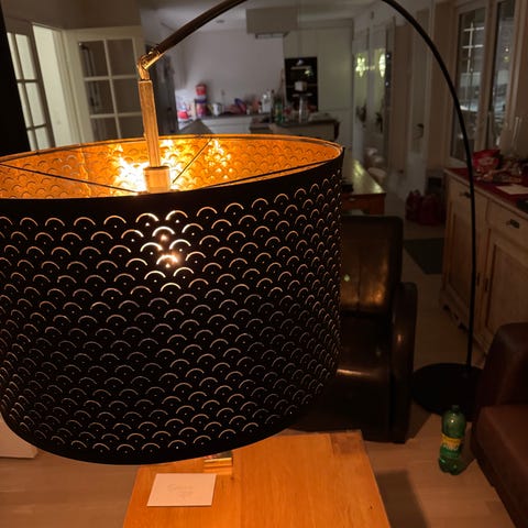 Sort gulvlampe med gulldetaljer fra IKEA. Ikke synlig brukt, nypris 899.