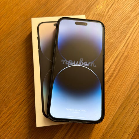 Apple iPhone 14 Pro Max med 256 GB lagringskapasitet. Telefonen har 85% batterikapasitet, og har vært brukt med både deksel og skjermbeskytter hele tiden jeg har hatt den.