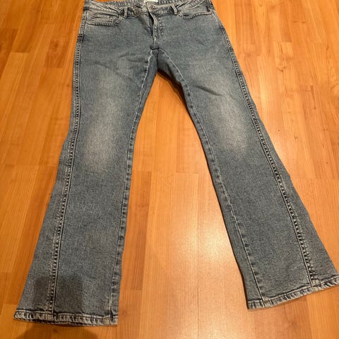 Selger Gina-jeans. På grunn av lengden har det oppstått et hull nederst på benet.