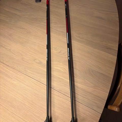 Selger meget godt brukte aluminium Swix langrennstaver i 110 cm. Trinser, bånd og håndtak fungerer som de skal. Lakkering er slitt.