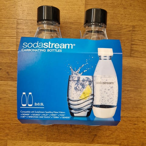 Sodastream CO2-flaske med kapasitet på 60 liter. Passer til bruk i Sodastream brusmaskiner for karbonering av drikkevarer. 2 stykker.
